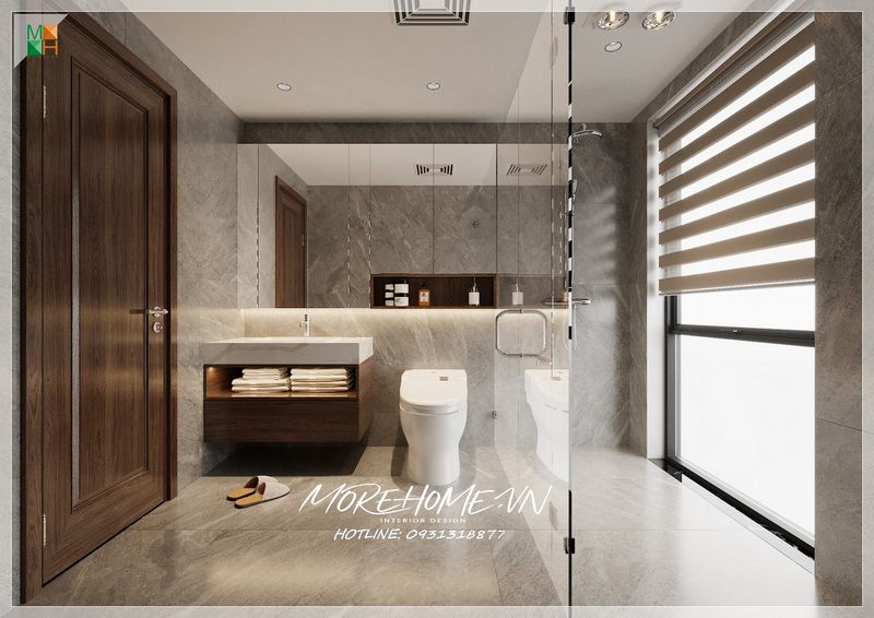 Mẫu phòng tắm hiện đại được trang bị bằng đá nhân tạo cao cấp có 2 gam màu: xám trắng và be với những đường vân loang độc đáo.